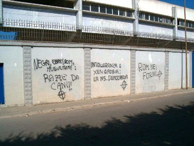 Ecco le vergognose scritte a firma FN (forza nuova o fronte nazionale?) che campeggiano sulle mura dello stadio e su quelle del palazzo dello sport di contrada Masseriola e incitano allo sterminio e all'odio razziale.