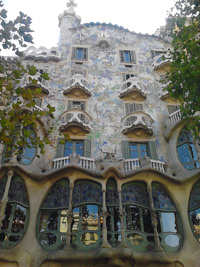 Ritornando sulla Rambla e proseguendo verso sinistra siamo attratti da un altro mondo magico di profumi, colori, grida e sapori: l'enorme mercato alimentare de Sant Josep, più conosciuto come la Boqueria. Ci accolgono, in prossimità dell'ingresso principale, due edicole storiche, quasi completamente nascoste dai prosciutti iberici appesi ai ganci tutt'intorno, profumo di salato nel naso, acquolina salata nella bocca. Ci avventuriamo oltre il cancello, curiosi come bambini, e restiamo a bocca aperta per la meraviglia: bancarelle immense traboccanti di frutta di tutti i tipi, fresca, secca, trasformata in frullati da passeggio, e poi spezie, uova, verdura, dolci, pesce di tutti i mari del mondo, specialità variegate e multicolore. Ogni singolo bancone di prodotti sembra un disegno su tela, ogni particolare è curato con precisione e dedizione per degustare con gli occhi, prima che con il naso e con il palato. La mercanzia che più ci attrae è il pescato, freschissimo, aragoste e granchi giganti, pesci di ogni tipo, cozze e molluschi di ogni specie: peccato che siamo in hotel! Perché quei giganteschi cannolicchi legati con lo spago devono essere proprio deliziosi, anche crudi, oltreché alla piastra, come ci consiglia la pescivendola, che cerca di convincerci all'acquisto con sorrisi e battute divertenti... la prossima volta ci fermeremo per gustarli, adesso la nostra meta è Casa Battlò, capolavoro di Gaudì per la ristrutturazione di un edificio, che pare simboleggi la leggenda di San Giorgio che uccide il drago.