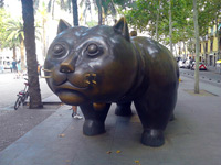 Sulle Ramblas tutto è movimento, frenesia, luce, profumi, suoni, musica, le cicale nelle bocche dei venditori ambulanti creano un continuo e sottile frastuono, si mescolano alle voci dei turisti, dei ristoratori, ai clacson delle auto e degli autobus: edicole, gabbie di uccelli e bancarelle di fiori, lettori di tarocchi, musicisti e mimi animano questo ampio viale alberato che da Placa de Catalunya porta fino al mare. Ed i piedi camminano, seguendo il naso e gli occhi, ora in su, ora in giù, ora a destra, ora a sinistra, guidati dalle meraviglie che ci si presentano davanti: in su gli edifici signorili, un drago modernista sporgente sulla facciata ed ombrelli inclinati sui balconi per un negozio decorato da Mirò, in giù una pavimentazione colorata a mosaico in Placa della Boqueria.