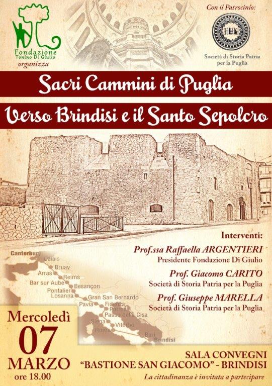 La Fondazione Tonino Di Giulio, con il Patrocinio della Società di Storia Patria per la Puglia, ha organizzato per mercoledì 7 marzo 2018, alle ore 18,00 presso la Sala Convegni del Bastione San Giacomo in Brindisi, una conversazione, presieduta dalla Prof. Raffaella Argentieri, Presidente della Fondazione, con il Prof. Giacomo Carito ed il Prof. Giuseppe Marella dal titolo: “Sacri Cammini di Puglia” e “Verso Brindisi e il Santo Sepolcro”.