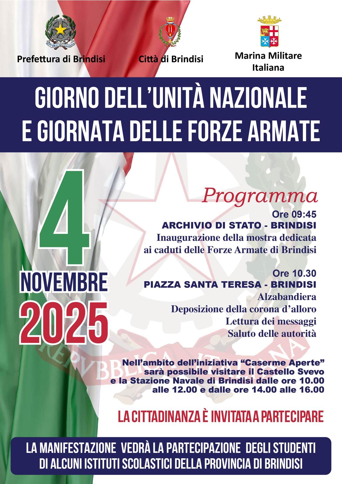 Martedì 4 novembre si terrà a Brindisi la tradizionale celebrazione del Giorno dell’Unità Nazionale e della Giornata delle Forze Armate, promossa e coordinata dalla Prefettura di Brindisi in collaborazione con il Presidio Militare e il Comune di Brindisi.