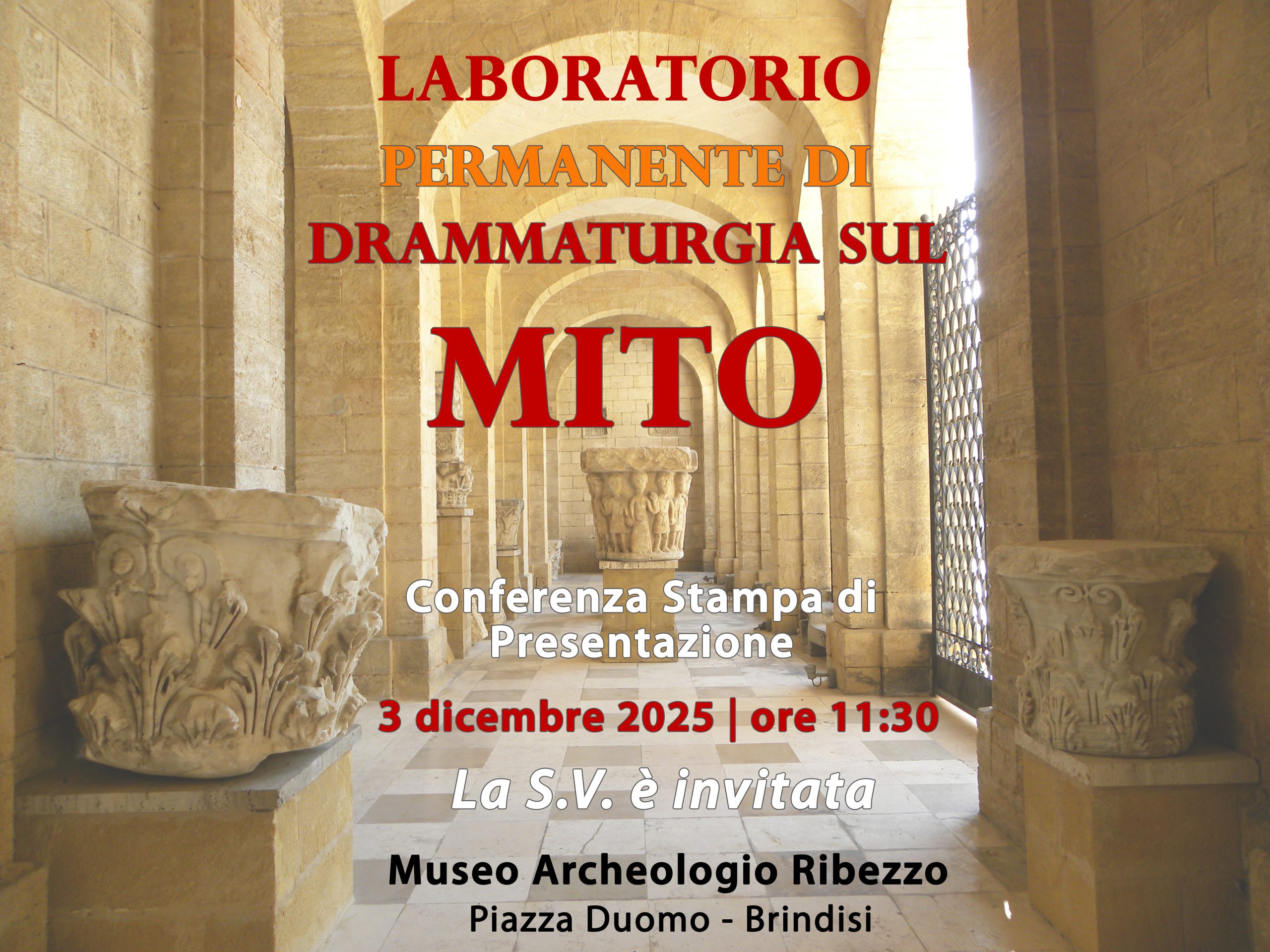 Si terrà mercoledì 3 dicembre 2025, ore 11.30, al Museo Ribezzo (Piazza Duomo – Brindisi) la conferenza stampa di presentazione del Laboratorio Permanente di Drammaturgia sul Mito, una nuova realtà di produzione culturale dedicata alla creazione scenica, partendo dai reperti archeologici custoditi nel Museo, nata dalla collaborazione tra MUSEO RIBEZZO ed ERGO SUM Produzioni in partenariato con FONDAZIONE NUOVO TEATRO VERDI.