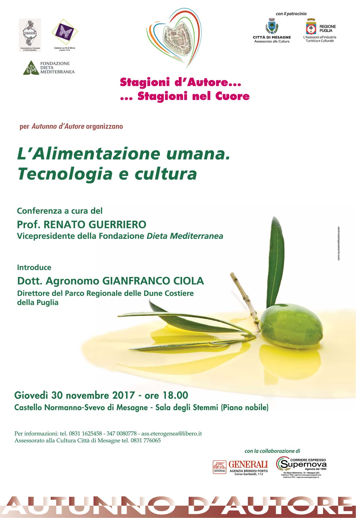 Giovedì 30 novembre 2017 alle ore 18.00 nell’auditorium del Castello Normanno-Svevo di Mesagne, si terrà la conferenza “Alimentazione umana. Tecnologia e cultura ” a cura del prof. Renato Guerriero, Vicepresidente della Fondazione “Dieta Mediterranea” che ha patrocinato la mostra d’Arte Contemporanea “Olio d’Artista” inserita nell’area tematica “Autunno d’Autore”.