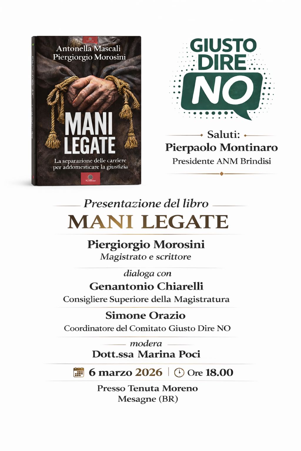 Si terrà giovedì 6 marzo 2026 alle ore 18.00, nella suggestiva cornice di Tenuta Moreno, a Mesagne (Brindisi), la presentazione del libro “MANI LEGATE – La separazione delle carriere per addomesticare la giustizia” (Paperfirst, 2026), firmato da Piergiorgio Morosini, presidente del Tribunale di Palermo, e scritto con la giornalista Antonella Mascali de Il Fatto Quotidiano.