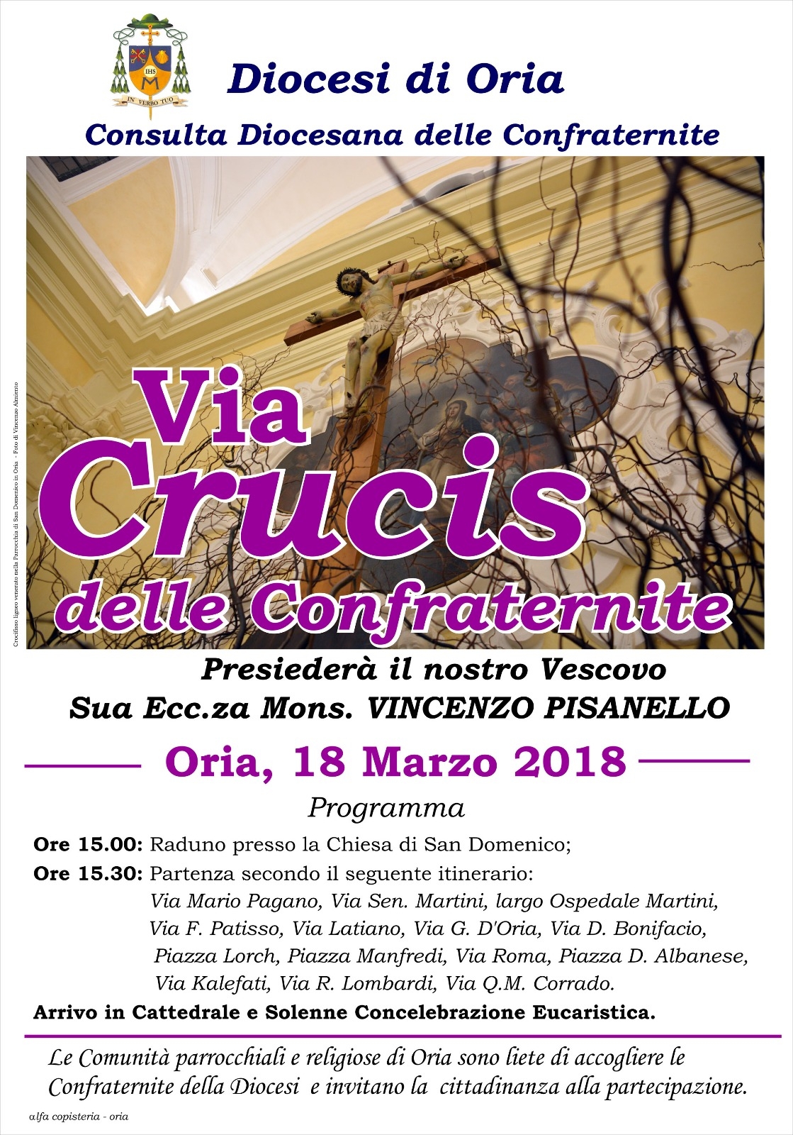 Le comunità parrocchiali di Oria e le quattro confraternite locali saranno liete di accogliere i confratelli e i fedeli provenienti da tutti i comuni della Diocesi.