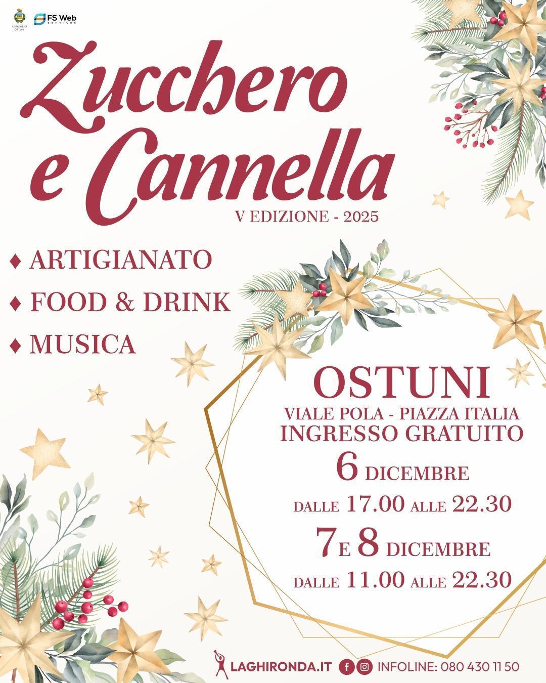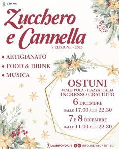 In armonia con il colore bianco di Ostuni, il villaggio di Zucchero e Cannella torna in città con le sue tipiche casette in legno. E da sabato 6 a lunedì 8 dicembre, giorno dell’Immacolata, fa da apripista alle festività di fine anno. Musica, artigianato e specialità enogastronomiche saranno i protagonisti della quinta edizione della manifestazione, pensata apposta per la città bianca dall’associazione La Ghironda in collaborazione con il comune di Ostuni. E con un percorso di profumi e colori, suoni e sapori, magia e tradizione, tra addobbi e prelibatezze locali, Zucchero e Cannella si propone con il suo programma studiato in chiave natalizia, con aperture tutte le sere sino alle 22.30, sabato dalle 17, domenica e lunedì per tutta la giornata a partire dalle 11.