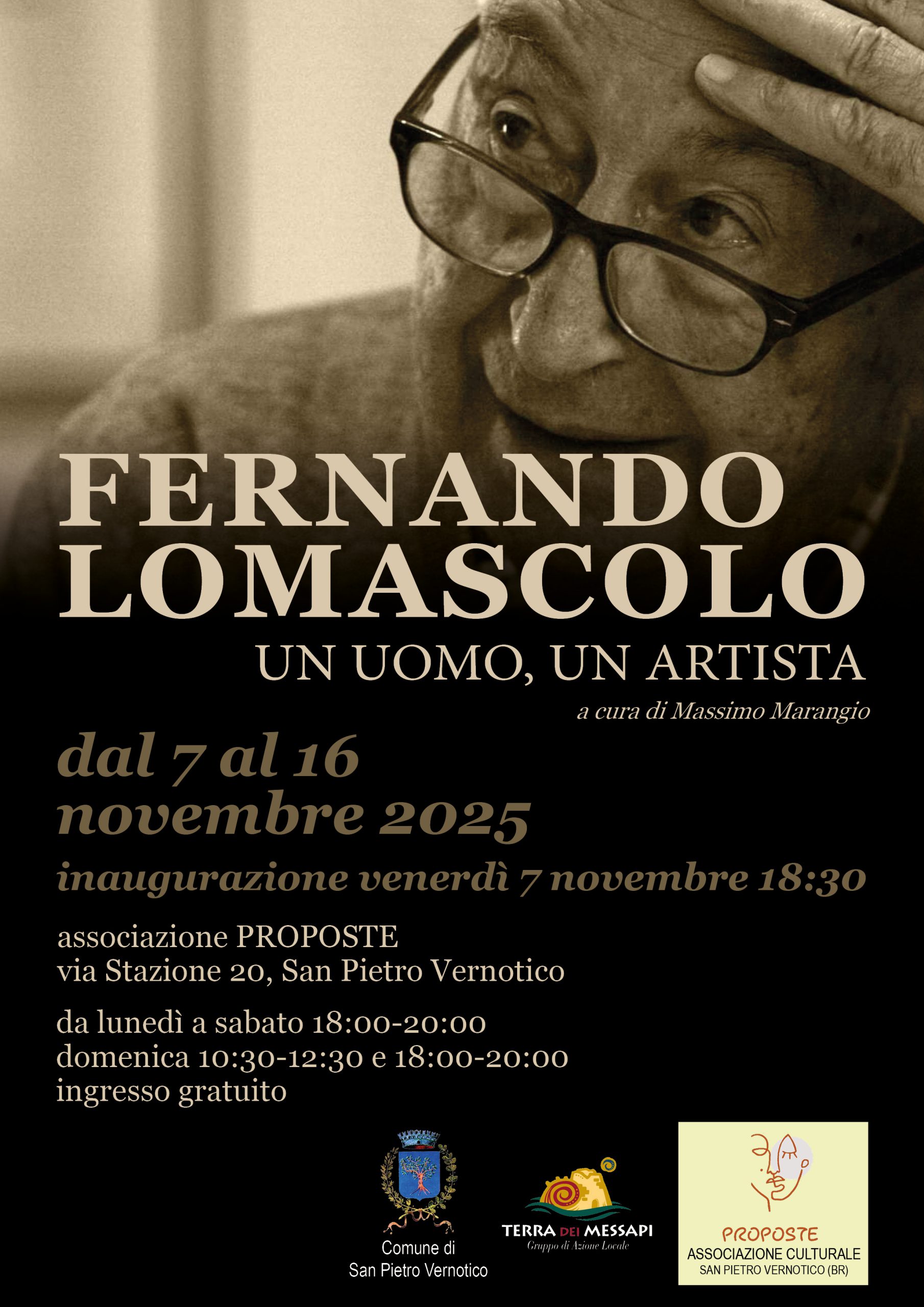 Un tributo al talento, alla passione e all’impegno di un uomo che ha saputo intrecciare arte e vita, lasciando un segno profondo nella comunità. È questo lo spirito della mostra “Fernando Lomascolo: un uomo, un artista”, che sarà presentata mercoledì 5 novembre 2025, alle ore 9:00, nella Sala Consiliare del Comune di San Pietro Vernotico, nel corso di una conferenza stampa organizzata dall’Associazione Culturale “Proposte”, con il patrocinio del GAL Terra dei Messapi e dell’Amministrazione Comunale.
