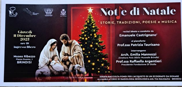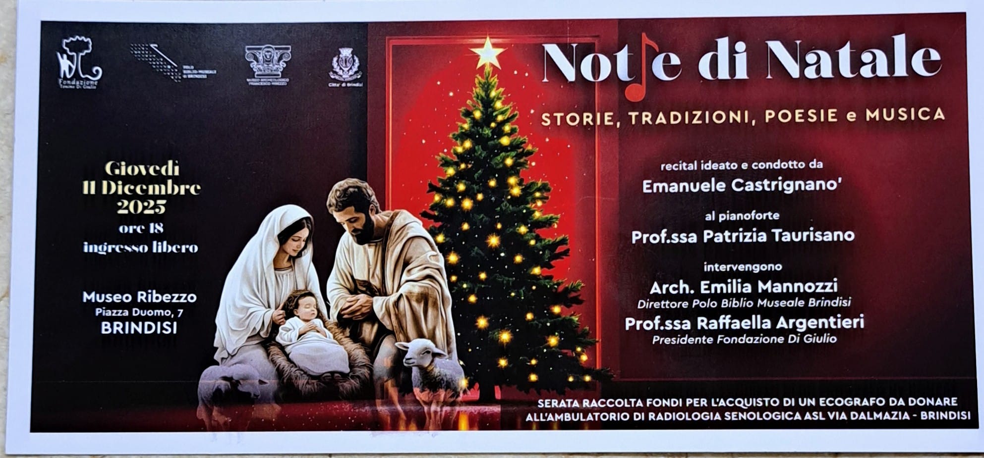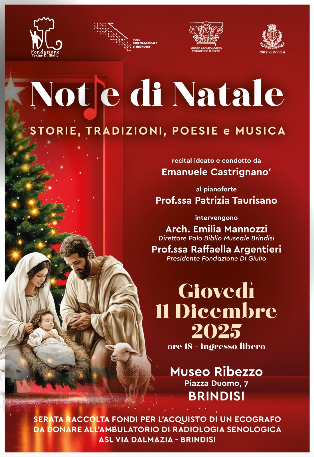 La Fondazione Di Giulio, con il patrocinio della Città di Brindisi e in collaborazione con il Polo Biblio-Museale “Ribezzo”, promuove giovedì 11 dicembre 2025 alle ore 18.00, al Museo Ribezzo, il recital “NOT(t)E di Natale”, un viaggio tra storie, tradizioni, poesie e musica alle porte delle festività.