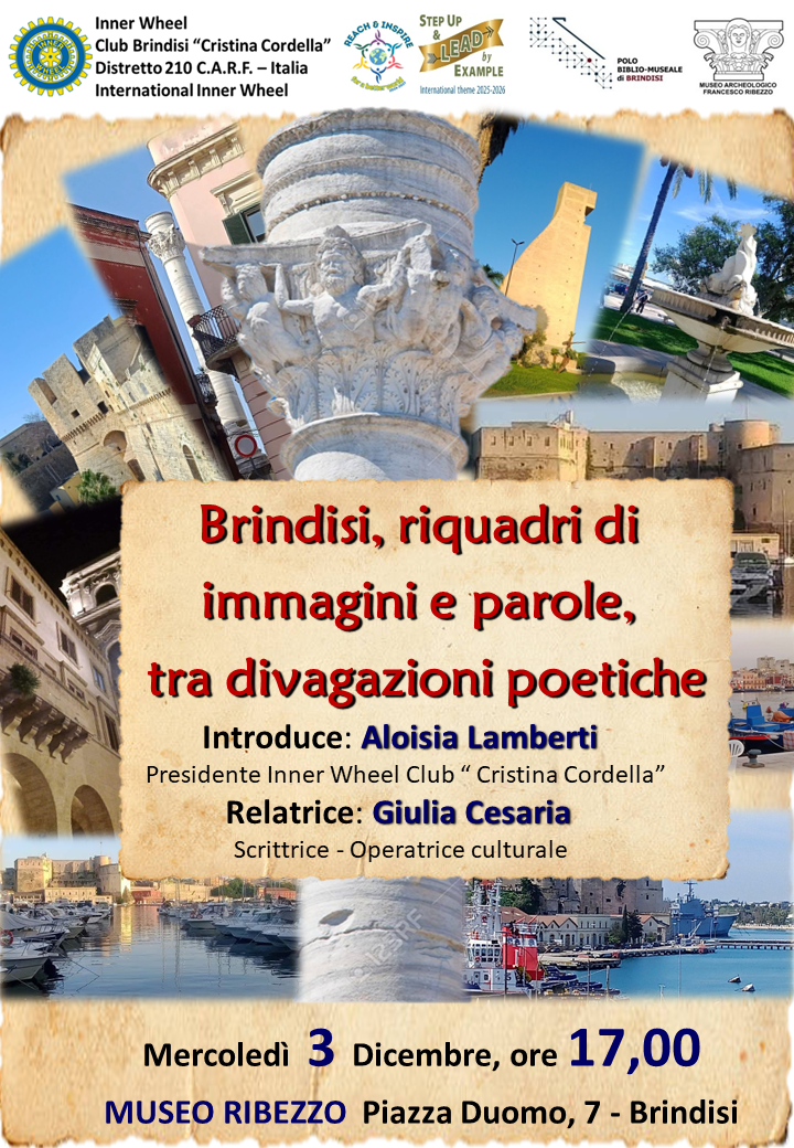 Un percorso fatto di immagini, memorie e suggestioni. Mercoledì 3 dicembre, alle 17, il Museo Ribezzo ospita l’evento “Brindisi, riquadri di immagini e parole, tra divagazioni poetiche”, promosso dal Club Inner Wheel “Cristina Cordella” in collaborazione con il Polo Biblio-Museale di Brindisi.