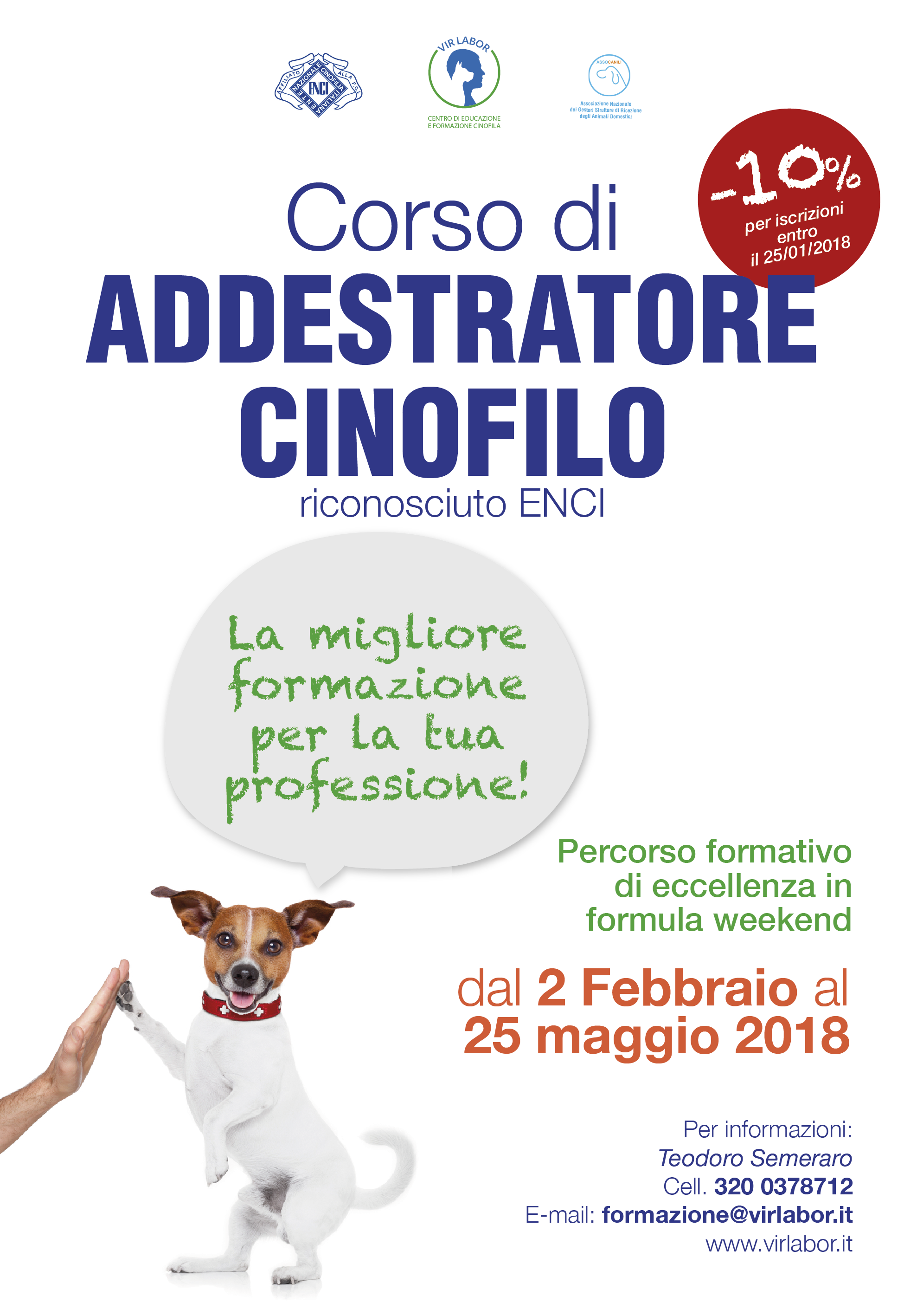 Per questo, il Centro di Formazione ed Educazione Cinofila Vir Labor organizza, da 2 febbraio al 25 maggio 2018, il primo Corso di Formazione del Salento per Addestratore Cinofilo riconosciuto dall’ENCI (Ente Nazionale della Cinofilia Italiana) a garanzia di alti standard di qualità e professionalità.