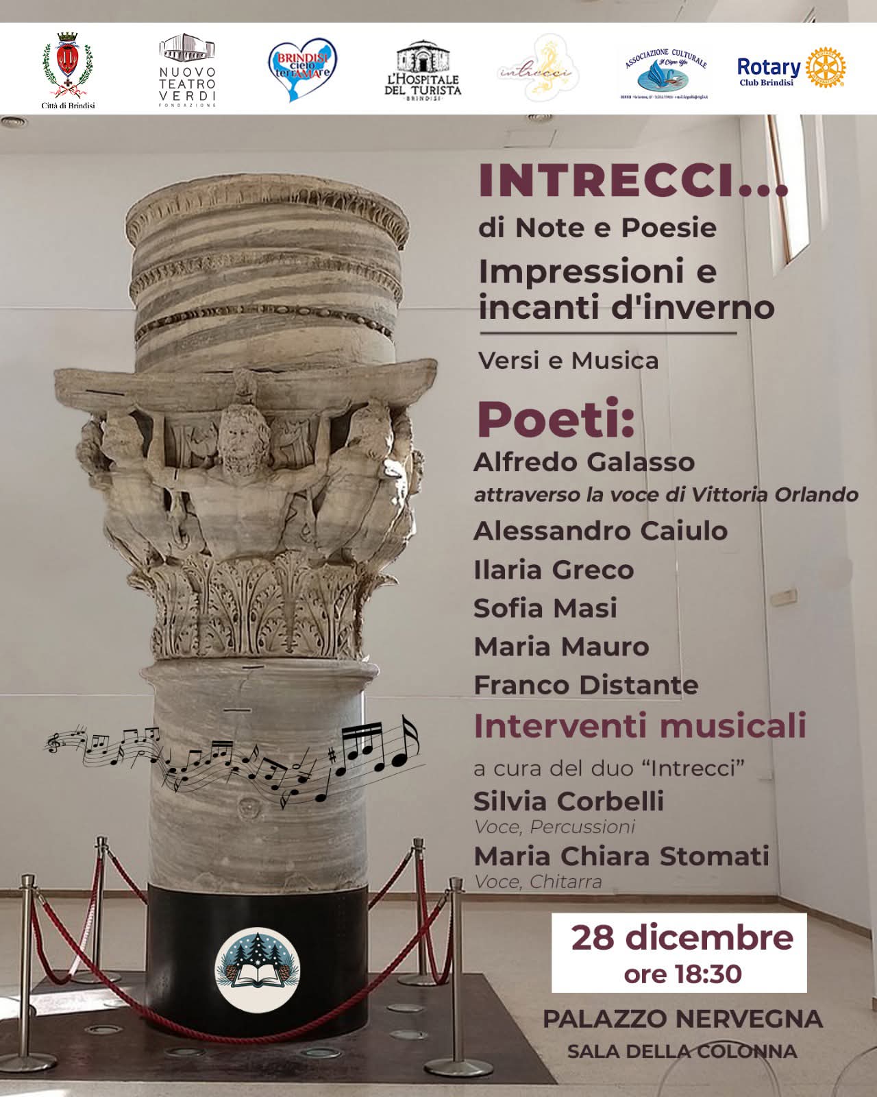 Con il duo musicale “Intrecci”, formato da Silvia Corbelli e Maria Chiara Stomati, e le associazioni culturali “Brindisi AMA tra cielo terra e mare” e “Il Cigno Blu”, letture poetiche a cura di Sofia Masi, Ilaria Greco, Maria Mauro, Alessandro Caiulo e Franco Distante, con un passaggio dedicato ai versi del poeta brindisino Alfredo Galasso nella voce dell’attrice Vittoria Orlando.