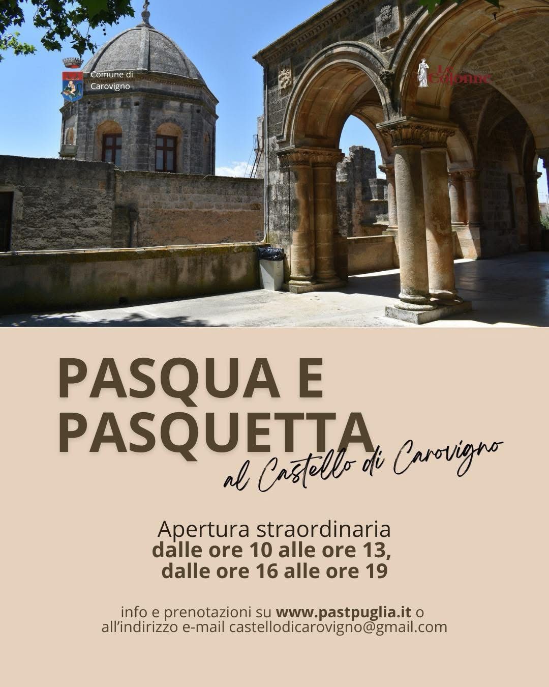 In occasione delle festività pasquali, il Castello di Carovigno sarà aperto al pubblico anche domenica 5 aprile e lunedì 6 aprile, offrendo a cittadini e visitatori la possibilità di scoprire uno dei principali luoghi di interesse storico e culturale del territorio.