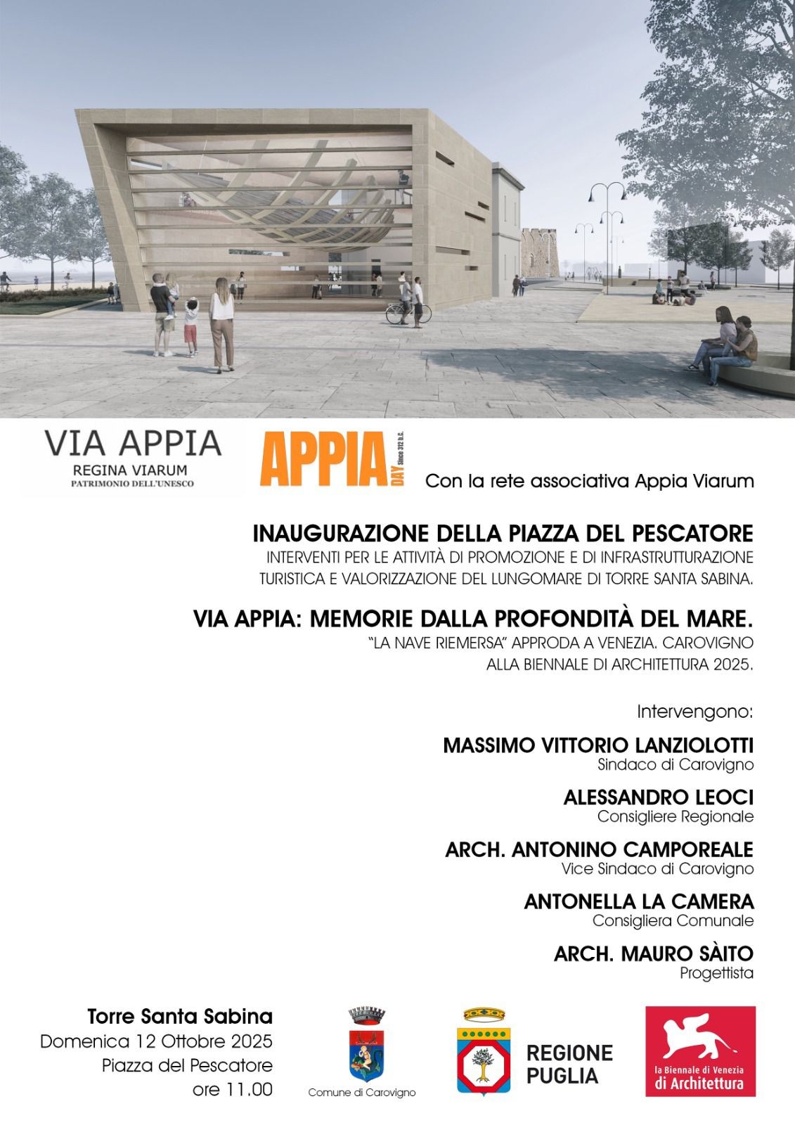 Un’iniziativa che intende valorizzare il patrimonio sommerso e la memoria storica legata all’antica via Appia, che nel territorio di Carovigno si fa ponte tra terra e mare, tra archeologia, natura e cultura. “Con queste iniziative – dichiara il Sindaco di Carovigno – celebriamo l’ingresso dell’Appia tra i siti UNESCO e rilanciamo il nostro impegno per una promozione culturale e turistica che parta dalle nostre radici e guardi al futuro, nel segno della sostenibilità e dell’identità territoriale”. Le celebrazioni si inseriscono nel ricco programma nazionale dell’Appia Day 2025, che vede la Puglia protagonista con eventi, cammini e incontri dedicati alla riscoperta di tutte le ricchezze peculiari e identitari del nostro territorio con itinerari, visite guidate ed eventi culturali lungo l’antico tracciato della via Appia. Ai due momenti celebrativi interverranno oltre al primo cittadino, Massimo Lanzillotti, il consigliere regionale Alessandro Leoci, il vice sindaco, Antonino Camporeale, la consigliera comunale Antonella La Camera e il progettista Arch. Mauro Saito.