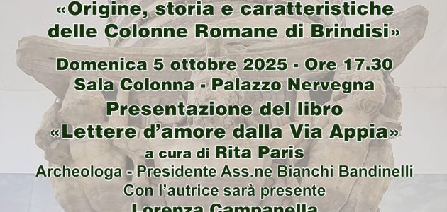 Il secondo appuntamento avrà luogo domenica 5 ottobre alle 17,30 con la presentazione del libro «Lettere d’amore dalla Appia» a cura di Rita Paris nella Sala della Colonna di Palazzo Nervegna. Anche questo evento a ingresso libero, con la presenza della curatrice, archeologa, già dirigente del Parco Archeologico dell’Appia Antica a Roma, attuale presidente dell’Associazione Bianchi Bandinelli. All’incontro parteciperà anche la dottoressa Lorenza Campanella, che dello stesso Parco è responsabile dell’Ufficio Comunicazione e Promozione.