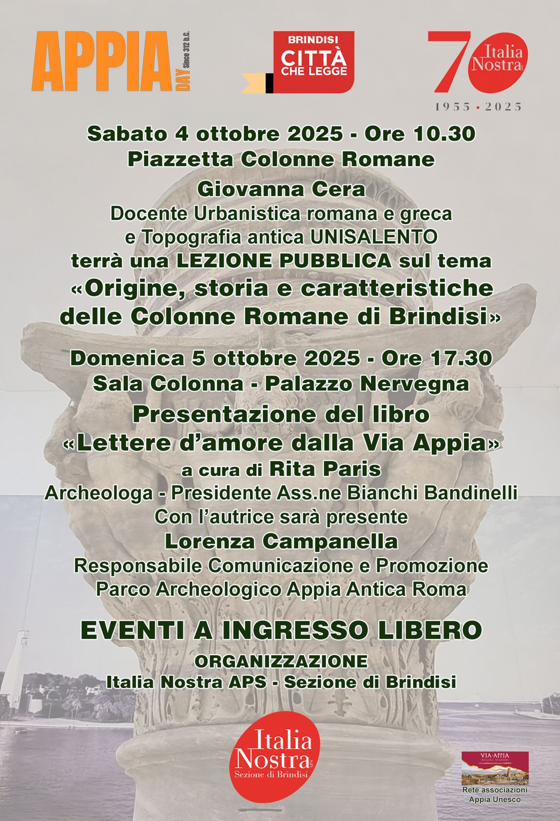 Nel quadro del ricco programma di iniziative dell’APPIA DAY 2025, Italia Nostra Sezione di Brindisi organizza due eventi di rilevante interesse culturale legati alla Regina Viarum.