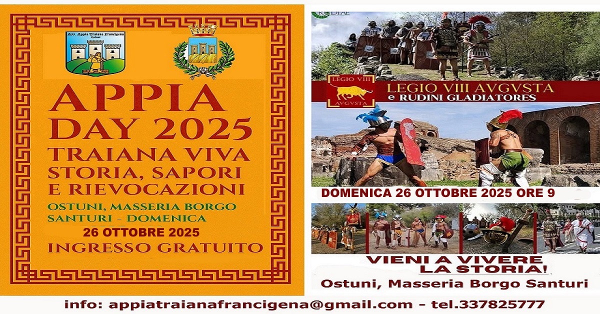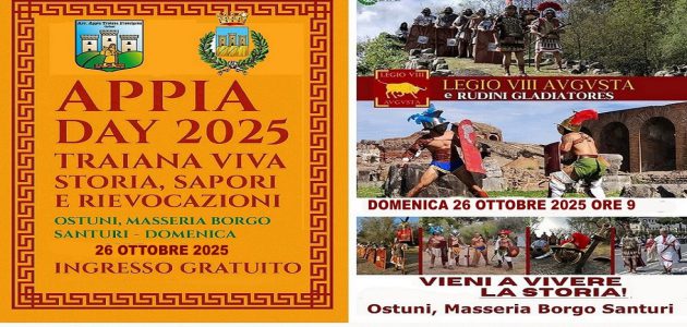 L’associazione Appia Traiana Francigena APS, con il patrocinio e il contributo del Comune di Ostuni, comunica che l’evento Appia Day 2025 – Traiana Viva, inizialmente previsto per il 5 ottobre e rinviato a causa delle avverse condizioni meteorologiche, sarà regolarmente svolto domenica 26 ottobre 2025, presso la Masseria Borgo Santuri, lungo il tracciato storico della Via Appia Traiana.