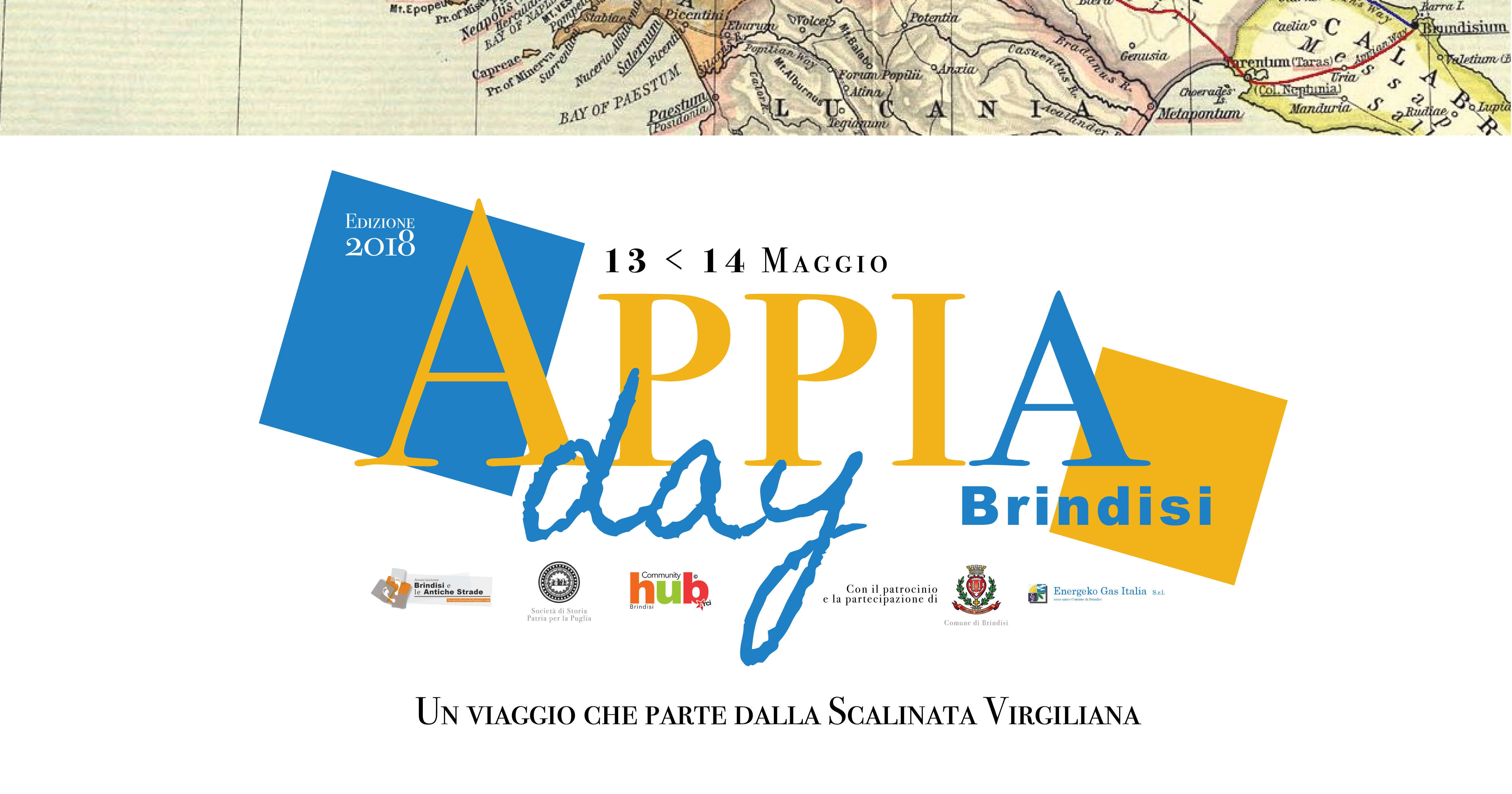 L’Associazione “Brindisi e le antiche strade”, In collaborazione con la “Società di Storia Patria per la Puglia” e “Community HUB – Brindisi” propongono, in occasione dell’“Appia Day” un’iniziativa, in continuità con quanto già fatto lo scorso 5 maggio, nelle giornate del 13 e 14 maggio, estesa, quindi, anche al lunedì pomeriggio affinché l’evento sia fruibile dai croceristi in transito in città. L’ “Appia Day” è un evento nazionale alla sua terza edizione (cui Brindisi partecipa per la prima volta) previsto per domenica 13 maggio, che prevede moltissime iniziative culturali lungo il percorso da Roma a Brindisi, terminale della Regina Viarum.