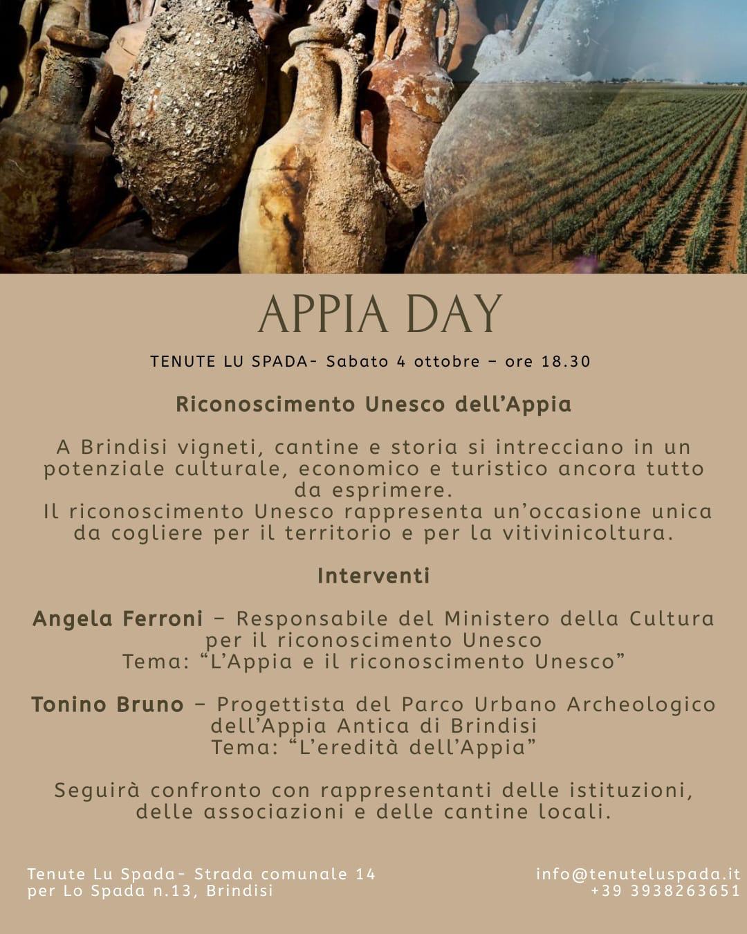 Il 4 ottobre 2025, in occasione dell’Appia Day, sei cantine del territorio brindisino – Risveglio Agricolo, Tenute Lu Spada, Tenute Rubino, Masseria Masciullo, Botrugno, Tenute Bellamarina – apriranno le proprie porte al pubblico proponendo percorsi ed esperienze uniche ispirate al tema “Vini e vigneti del tratto terminale dell’Appia Antica”.