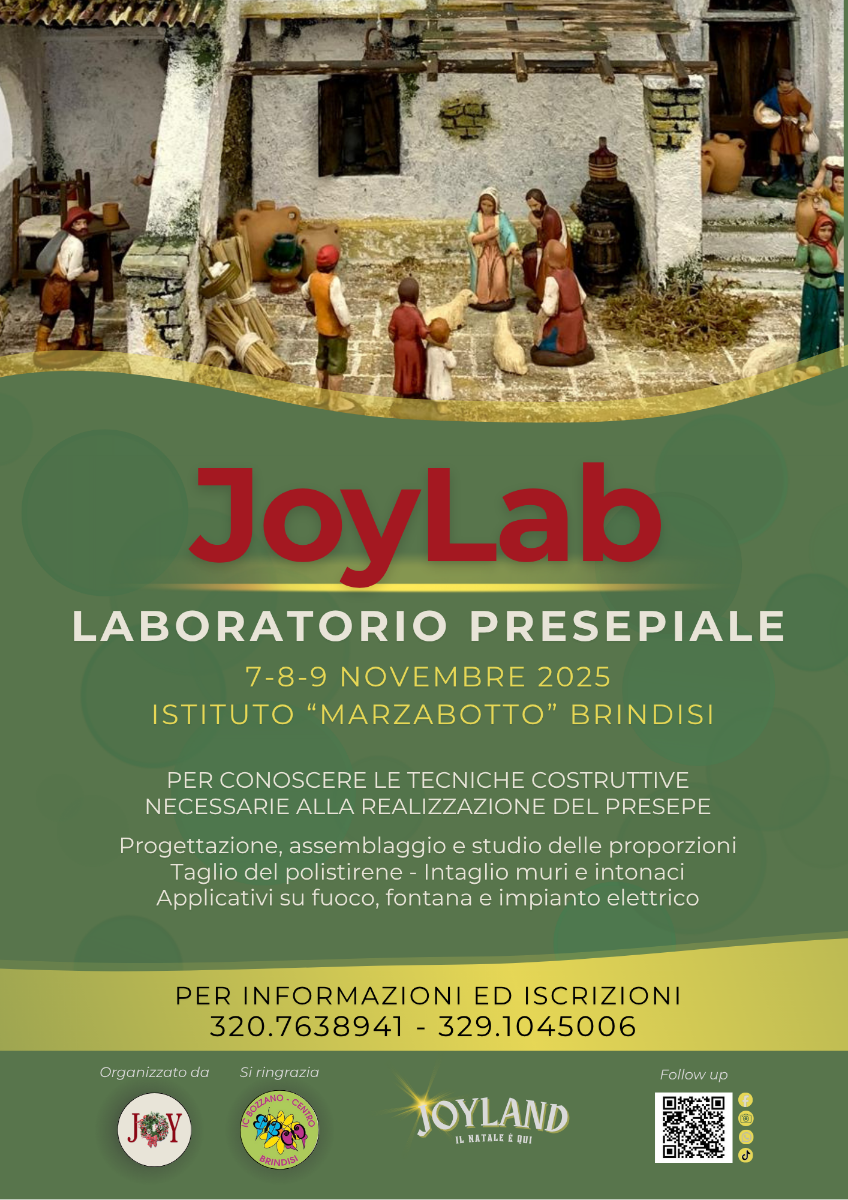 Torna per il secondo anno consecutivo il laboratorio presepiale “JoyLab”, promosso dall’associazione Joy di Merine (Lecce), che anche quest’anno farà tappa a Brindisi grazie alla collaborazione con l’Istituto “Marzabotto”. L’appuntamento è fissato per 7, 8 e 9 novembre 2025 e le iscrizioni sono ufficialmente aperte.