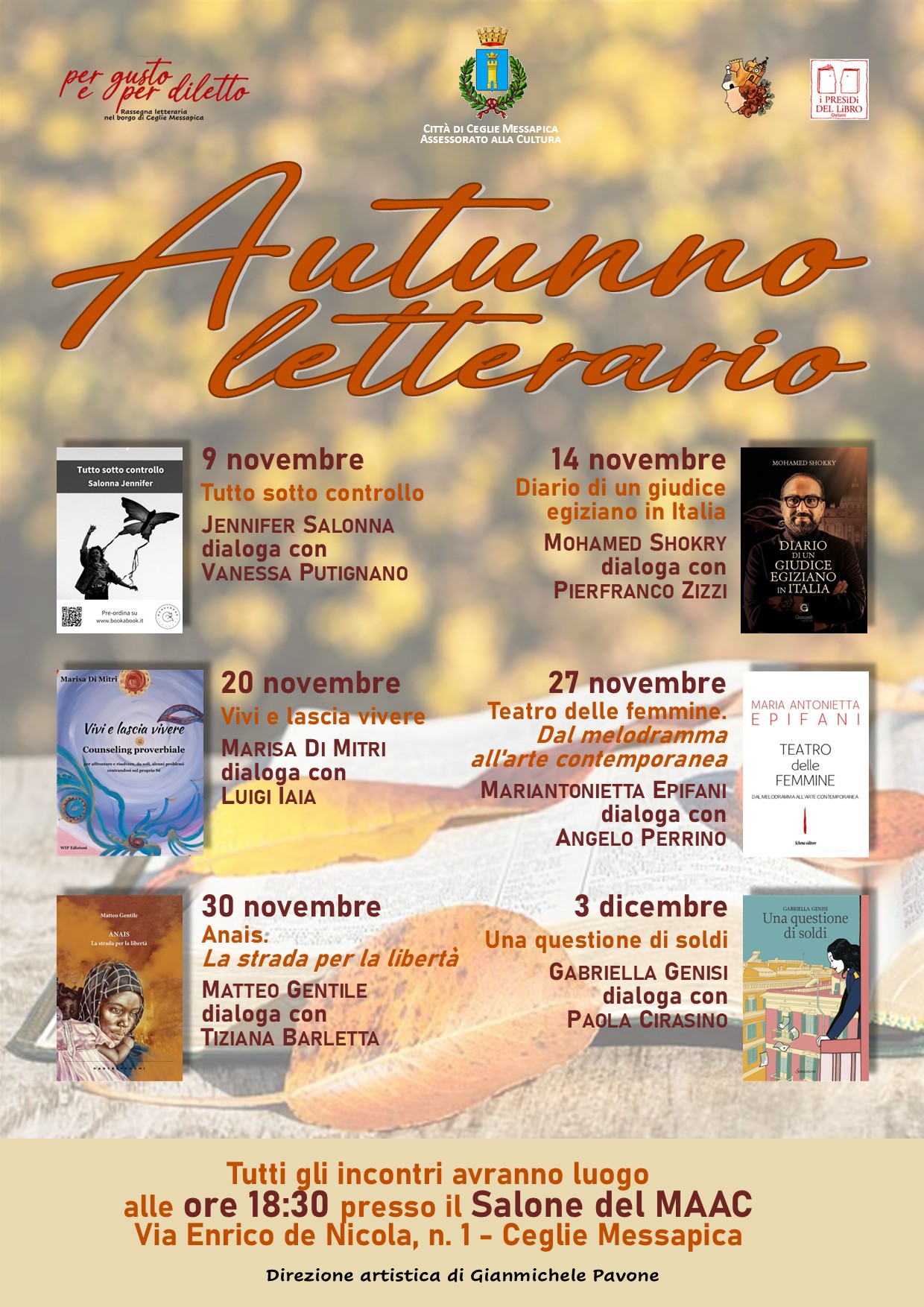 Dal 9 novembre al 3 dicembre la città di Ceglie Messapica ospiterà sei appuntamenti all’insegna della passione per la scrittura e della voglia di raccontare in una piccola rassegna dal titolo “Autunno letterario” curata dall’Amministrazione comunale in collaborazione con l’associazione MittAffett, il Presidio del Libro e con la direzione artistica di Gianmichele Pavone.