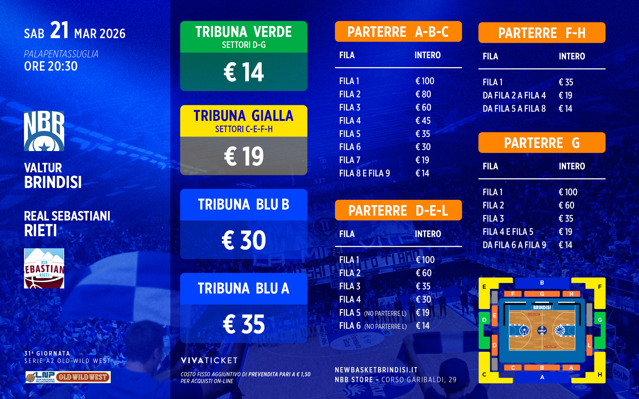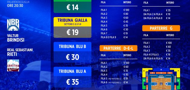 Si comunica che a partire dalle ore 17:00 di martedì 17 febbraio, è possibile acquistare i biglietti per assistere all’unico match casalingo di campionato in programma per il mese di marzo. La Valtur Brindisi sfiderà sabato 21 marzo la Real Sebastiani Rieti, in un calendario che prevede solo match esterni (Rimini, Cento e Mestre) e il weekend della Final Four di Coppa Italia.