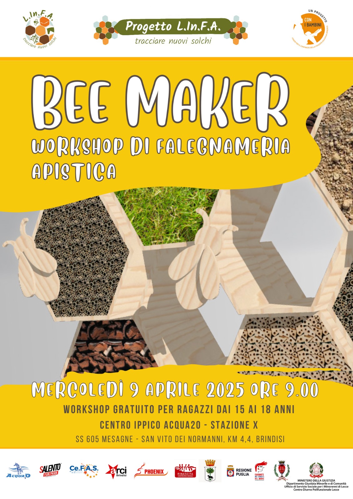 Scaffali per il miele, ma anche spazi per immaginare, creare, cambiare. Si chiama “Bee Maker” il workshop di falegnameria artistica promosso dal progetto Linfa e in programma mercoledì 9 aprile 2025, a partire dalle ore 9.00, presso il Centro Ippico Acqua2o – Stazione X, sulla SS 605 Mesagne – San Vito dei Normanni, km 4,4, a Brindisi.