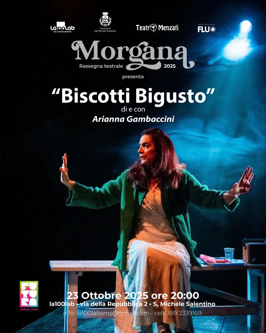 Giovedi 23 ottobre, alle ore 20.00 presso la100lab di San Michele Salentino, debutta Biscotti bigusto, monologo scritto e interpretato da Arianna Gambaccini, primo appuntamento della rassegna MORGANA, il festival teatrale promosso da Se Puede Cooperativa Sociale nell’ambito del bando FUTURA – La Puglia per la Parità.