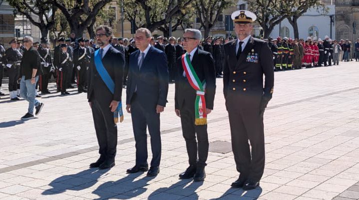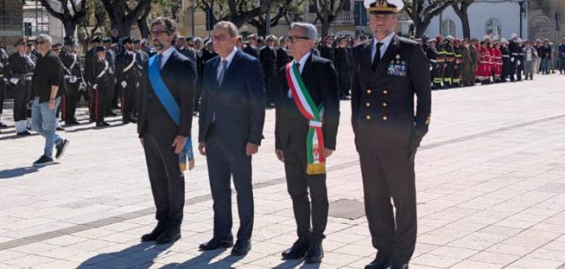 La cerimonia si è aperta con il passaggio in rassegna dei reparti militari e dei Corpi dello Stato da parte del prefetto Guido Aprea. A seguire, l’alzabandiera sulle note dell’Inno nazionale e la deposizione della corona d’alloro al Monumento ai Caduti hanno scandito i momenti più solenni.