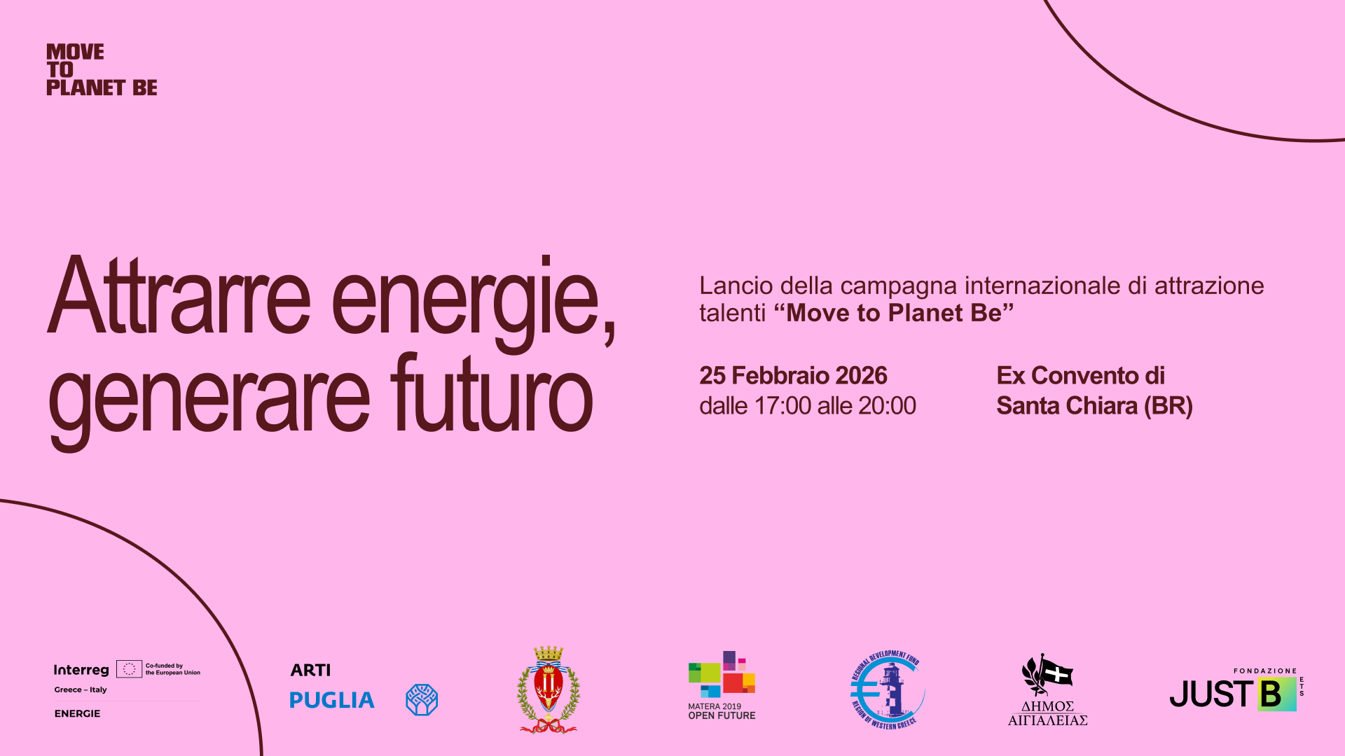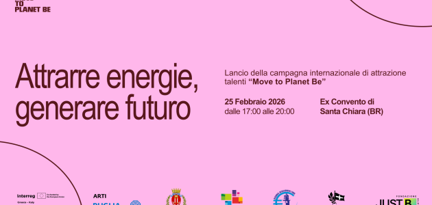 È aperta Move to Planet Be, nuova azione di promozione del territorio e campagna internazionale di attrazione talenti promossa da Fondazione Just B ETS come partner del progetto europeo ENERGIE (Interreg Grecia–Italia), coordinato da ARTI – Agenzia Regionale