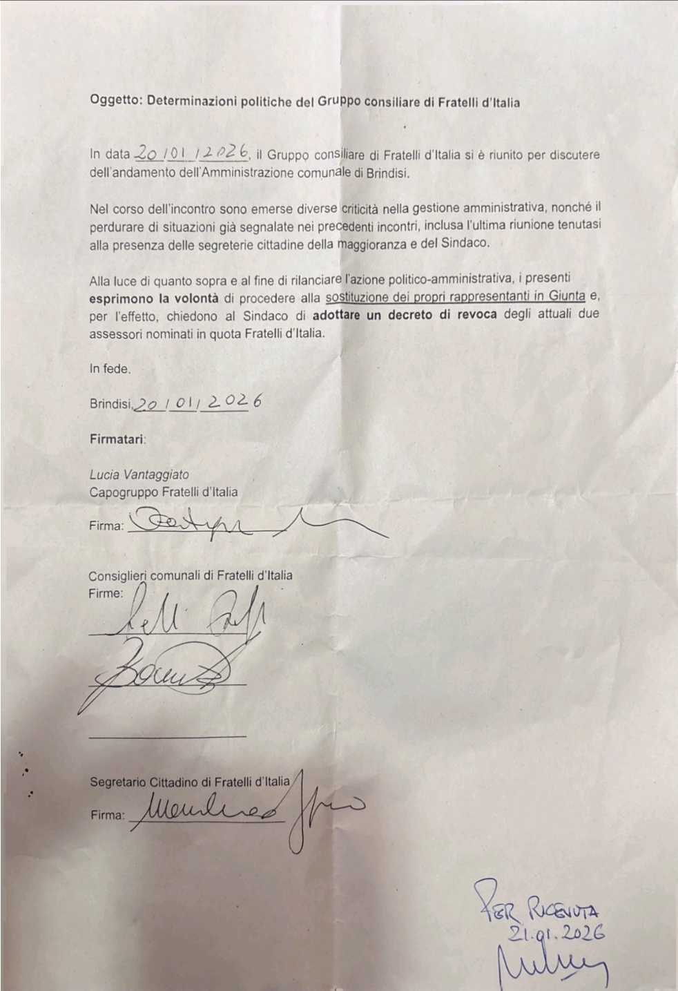 Il documento, protocollato per ricevuta il 21 gennaio 2026 da una firma che appare essere quella del Sindaco Marchionna, è sottoscritto dai vertici locali del partito: il Segretario Cittadino Massimiliano Oggiano, il Capogruppo Lucia Vantaggiato e i consiglieri comunali del gruppo Mario Borromeo e Raffaele De Maria. Manca la firma dell’altro consigliere, Cesare Mevoli.