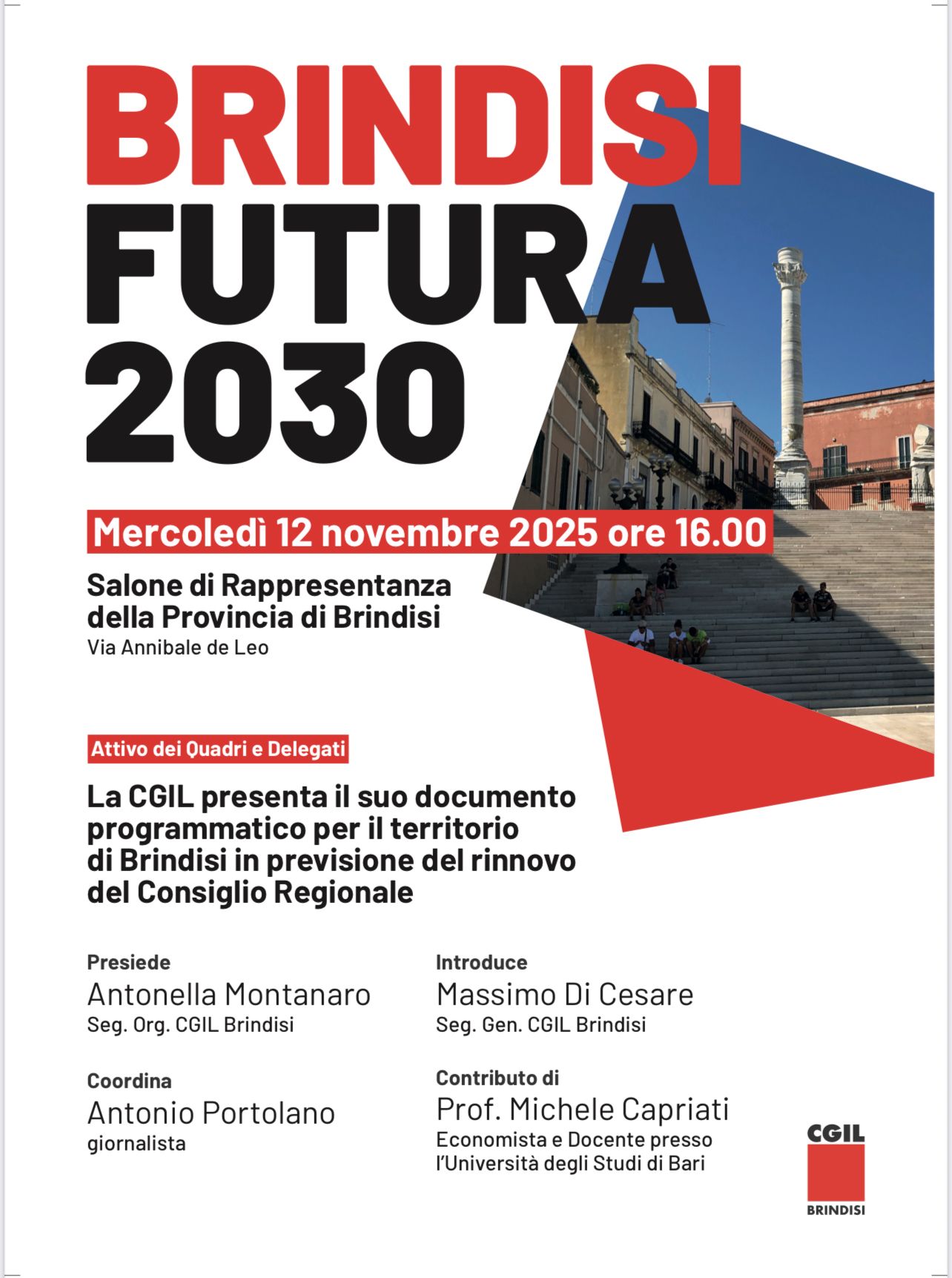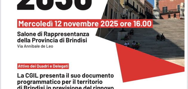 È questo l’obiettivo di Brindisi Futura 2030, il documento programmatico elaborato dalla Camera del Lavoro Territoriale della Cgil di Brindisi insieme alle categorie e alla rete dei delegati, che sarà presentato mercoledì 12 novembre 2025 alle ore 16.00 nel Salone di Rappresentanza della Provincia di Brindisi (via Annibale de Leo).