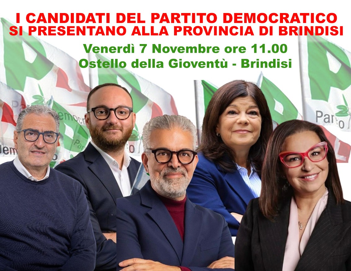 Si terrà venerdì 7 novembre alle ore 11.00, presso l’Ostello della Gioventù di Brindisi, la presentazione ufficiale dei candidati del Partito Democratico della provincia di Brindisi alle prossime elezioni regionali pugliesi del 23 e 24 novembre 2025.