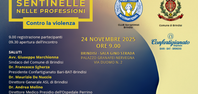 Il Soroptimist International Club di Brindisi organizza per lunedì 24 novembre 2025 alle ore 9.00, nella Sala Gino Strada di Palazzo Granafei-Nervegna (via Duomo 2), il seminario formativo “Sentinelle nelle Professioni, contro la Violenza”.