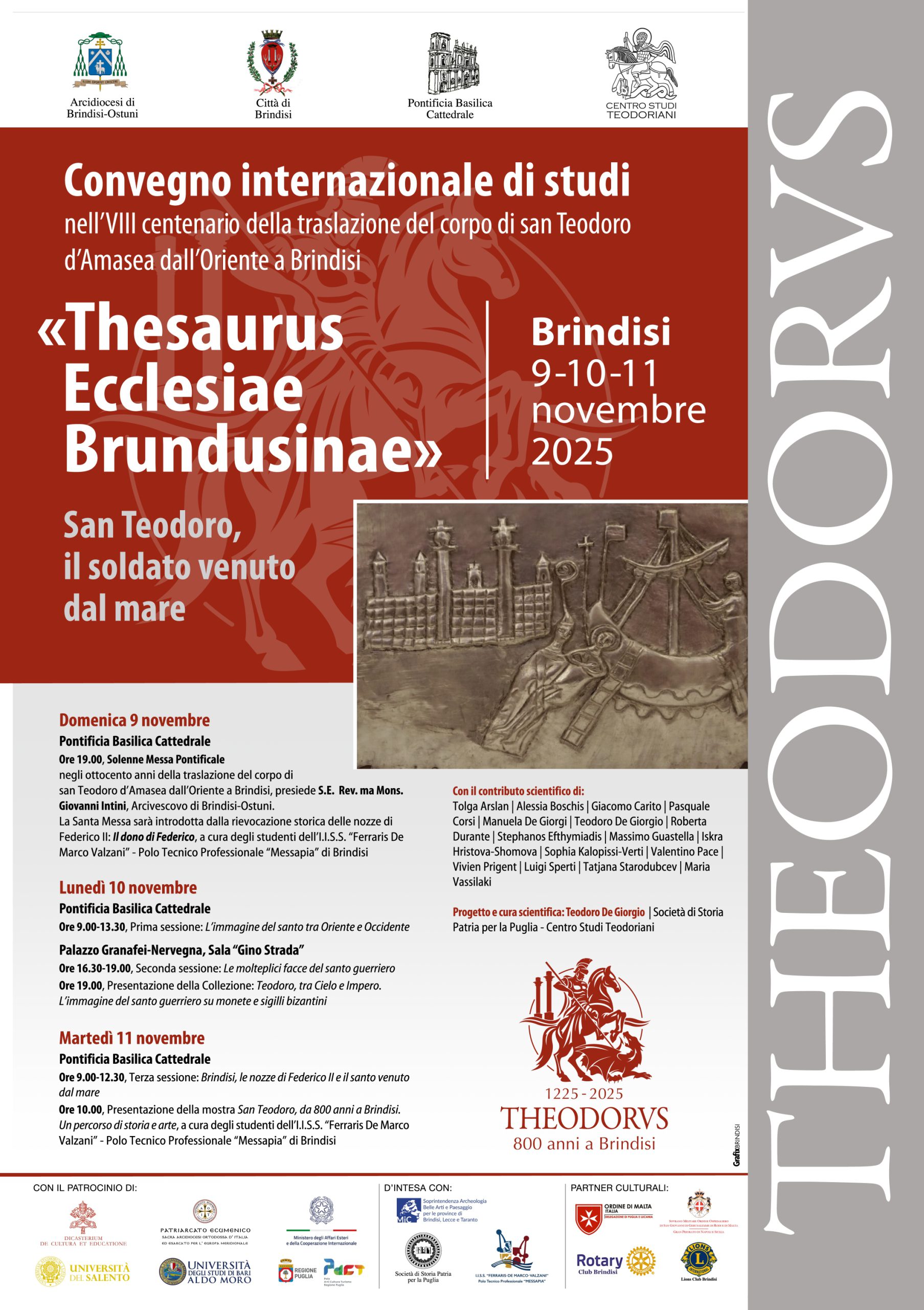 Mancano pochi giorni all’apertura del Convegno Internazionale di Studi «Thesaurus Ecclesiae Brundusinae». San Teodoro, il soldato venuto dal mare. Dal 9 all’11 novembre prossimi, Brindisi celebrerà l’ottavo centenario della traslazione del corpo di san Teodoro d’Amasea dall’Oriente (1225-2025): un momento di alto profilo sul piano culturale e delle relazioni ecumeniche.
