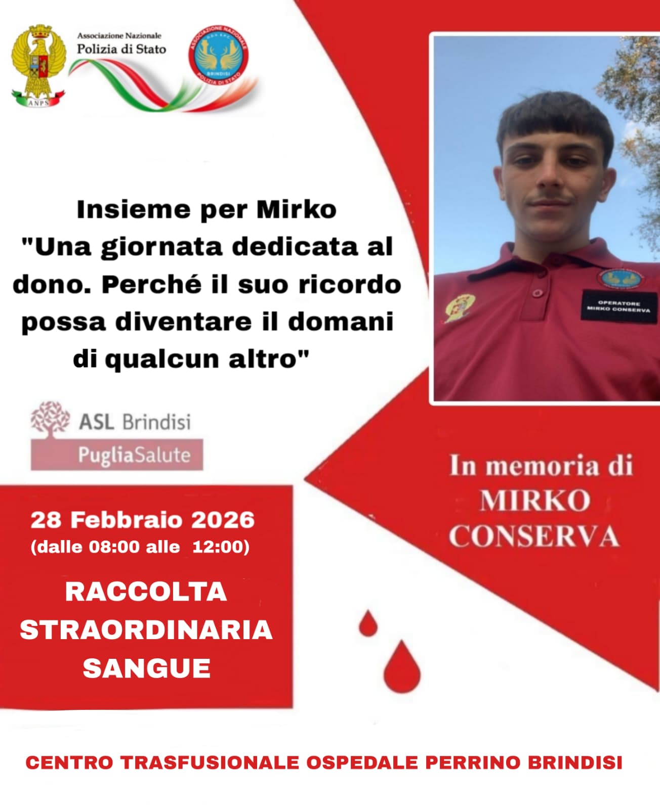 «Recentemente abbiamo perso un nostro volontario, Mirko Conserva, vittima di un incidente stradale. Nel mese di febbraio ricorre il suo compleanno e, insieme alla famiglia, abbiamo deciso di ricordarlo con un gesto concreto». Con queste parole, cariche di commozione e gratitudine, Carmelo Guglielmi, presidente della sezione di Brindisi dell’Associazione nazionale Polizia di Stato, annuncia la giornata di donazione sangue dedicata alla memoria del giovane brindisino scomparso il 15 settembre 2024 in via Caduti di via Fani.