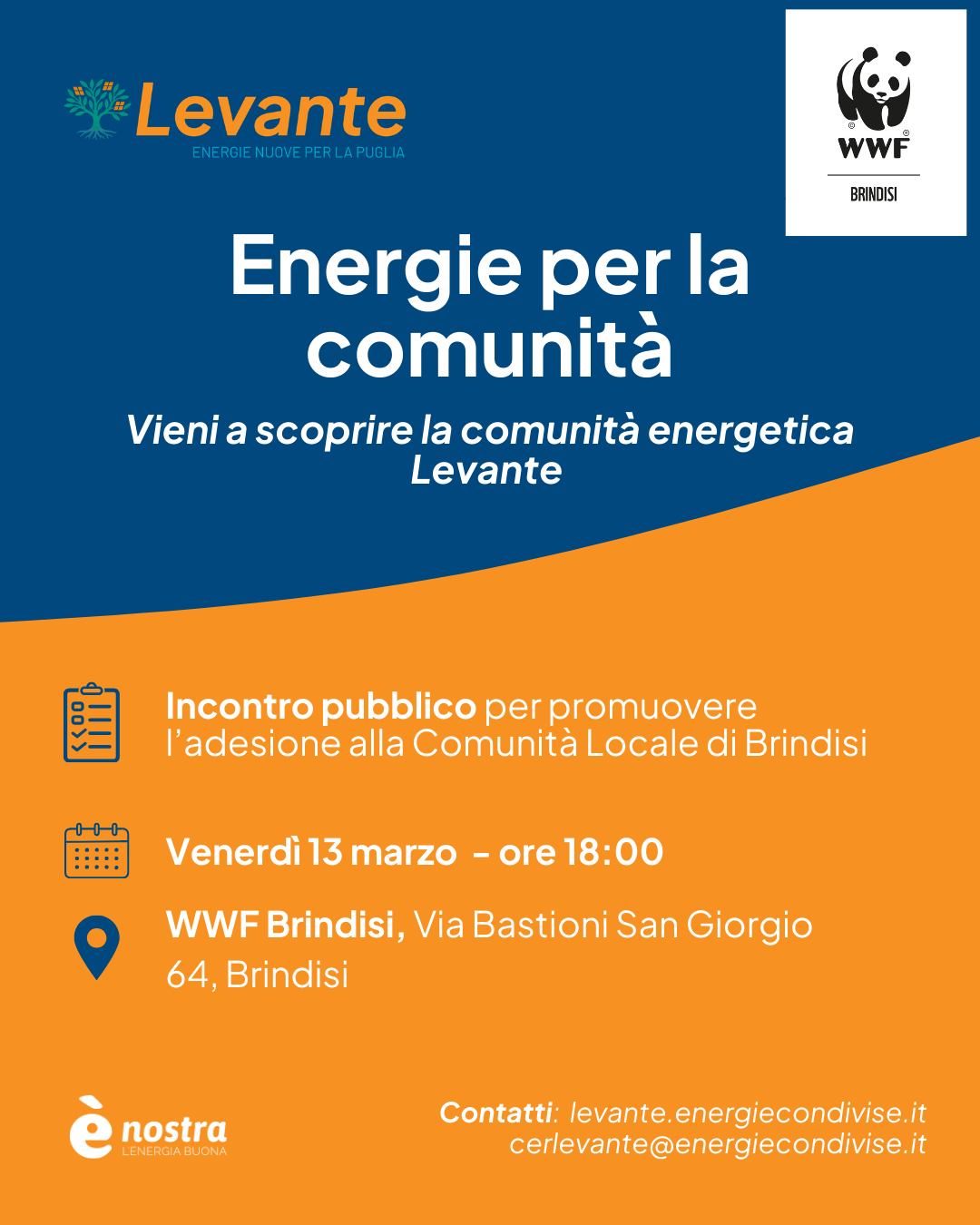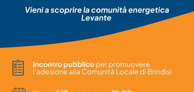 Prosegue il percorso di coinvolgimento della cittadinanza promosso dalla Comunità Energetica Levante. Venerdì 13 marzo si terrà un nuovo incontro pubblico dedicato alla scoperta e all’approfondimento della CER (Comunità Energetica Rinnovabile), una realtà nata a Brindisi, nell’aprile dello scorso anno, dalla collaborazione della cooperativa ènostra e WWF Brindisi e che sta già estendendo le proprie radici nel territorio pugliese con le sedi di Crispiano, Noci e Trani.