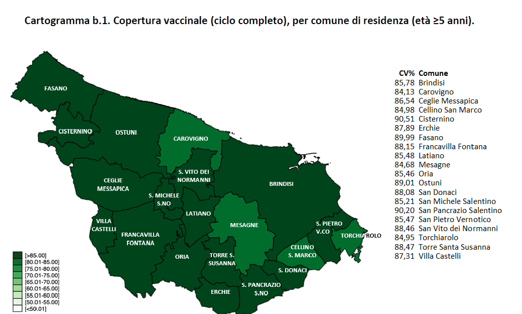 Fino al 13 luglio i residenti o domiciliati in provincia di Brindisi vaccinati con la prima dose sono 335.205, di questi 321.148 con la seconda dose e 244.592 con la terza dose, con una copertura vaccinale pari rispettivamente al 90,89%, all’87,08% e al 70,69%. Sono 4375 i residenti che hanno ricevuto la quarta dose. La copertura vaccinale con la prima dose relativa ai residenti con più di 80 anni di età è pari al 98,9%, al 96,9% per il ciclo completo e all’85,4% per la terza dose. I residenti di età compresa tra 5 e 11 anni vaccinati con prima dose risultano essere 12.984 per una copertura vaccinale pari al 59,9%.