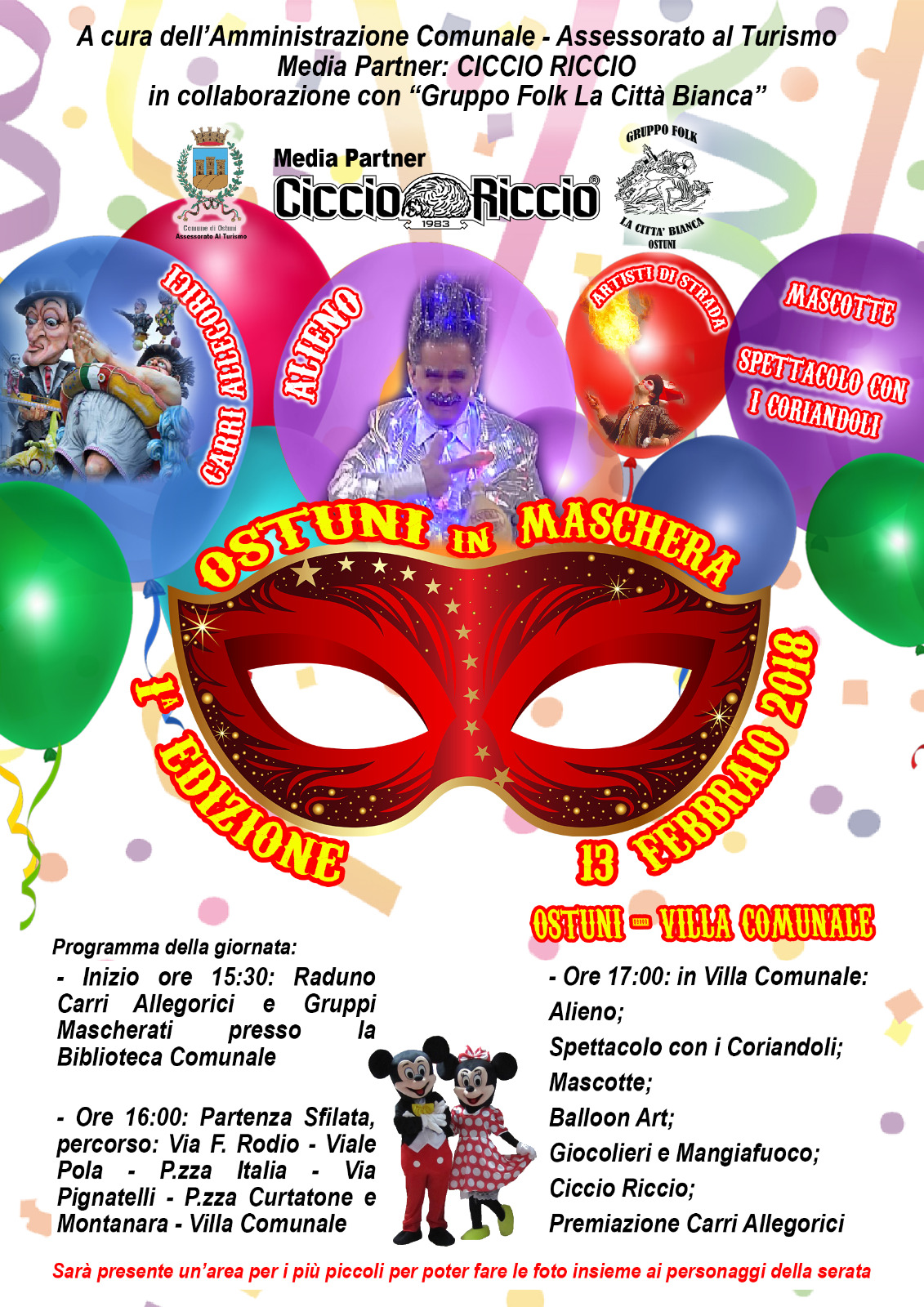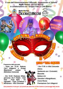 Il Carnevale ostunese si celebra di martedì grasso. Avrà inizio nel primo pomeriggio del 13 febbraio prossimo la lunga festa dedicata essenzialmente alla gioia dei bambini, ma pensata anche per il divertimento degli adulti. Promosso e sostenuto dall’assessorato alla Cultura e al Turismo del Comune di Ostuni, l’evento è a cura del Gruppo Folk “La Città Bianca” e vedrà la collaborazione di Ciccio Riccio, l’emittente radiofonica più seguita del brindisino.