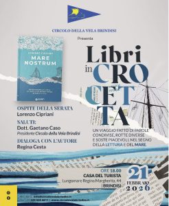 Nell’ambito della rassegna letteraria “Libri in crocetta”, il Circolo della Vela di Brindisi ha organizzato un incontro con Lorenzo Cipriani, autore del libro “Mare Nostrum” (Giunti editore). L’appuntamento è per sabato 21 febbraio, alle ore 18.00, presso la Casa del Turista. Dopo i saluti del Presidente del Circolo della Vela Gaetano Caso, Lorenzo Cipriani dialogherà con la coordinatrice di eventi culturali Regina Cesta.