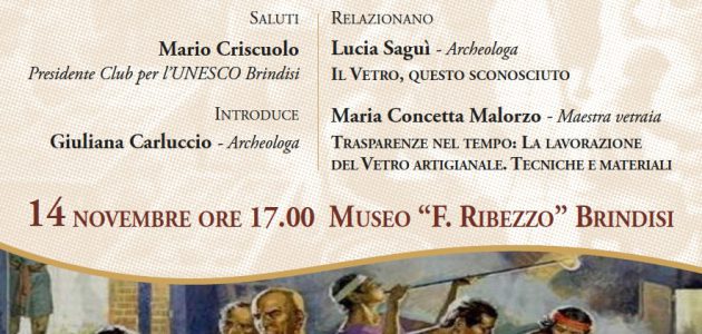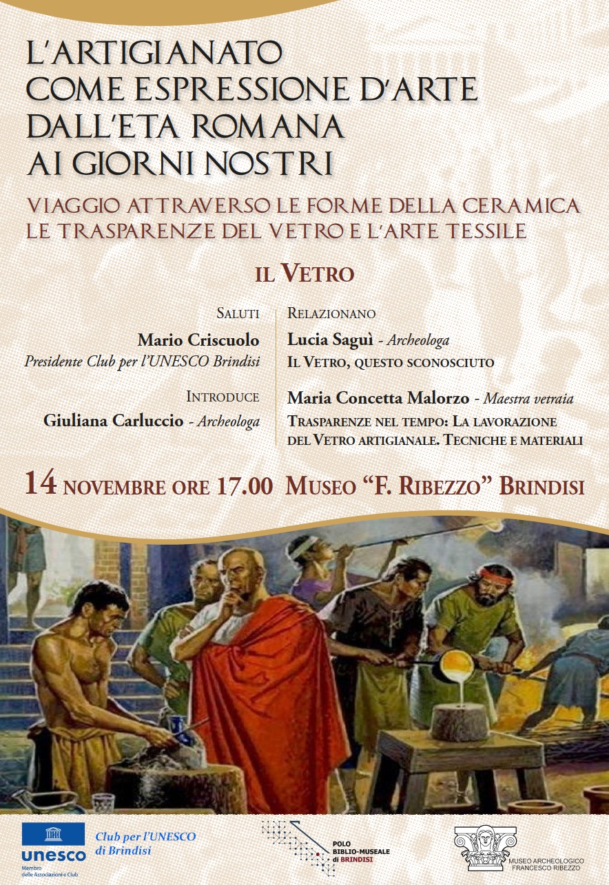 Il Club per l’ UNESCO di Brindisi in collaborazione con il Polo Biblio Museale di Brindisi organizzano per giorno venerdì 14 novembre alle ore 17.00, presso la sala conferenze del Museo Archeologico ”F. Ribezzo”, il secondo appuntamento relativo alla trilogia: “L’Artigianato come espressione d’arte dall’arte romana ai giorni nostri”.