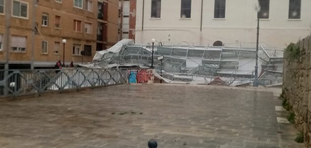 Paura nel primo pomeriggio di oggi a Brindisi, dove l’impalcatura montata per i lavori di riqualificazione dell’ex istituto di ragioneria “Marconi” è crollata a causa del forte vento.