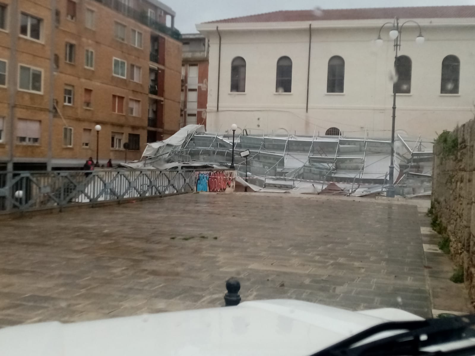 La struttura metallica, divelta e ripiegata su se stessa, ha ceduto nella zona retrostante l’edificio, riversandosi sulla piazza e sull’area di passaggio pedonale. Solo per un caso fortunato non si registrano feriti: al momento del cedimento non risultavano persone presenti nella zona.