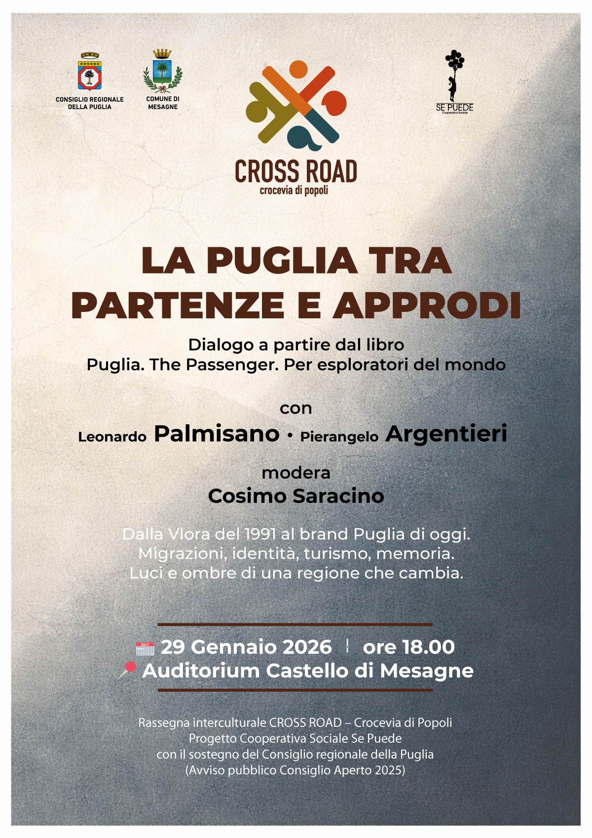 Si terrà mercoledì 29 gennaio, alle ore 18.00, presso l’Auditorium del Castello di Mesagne, l’evento conclusivo di CROSS ROAD – Crocevia di Popoli, rassegna interculturale dedicata alle migrazioni e alle memorie collettive, promossa dalla Cooperativa Sociale Se Puede e realizzata con il sostegno del Consiglio Regionale della Puglia.