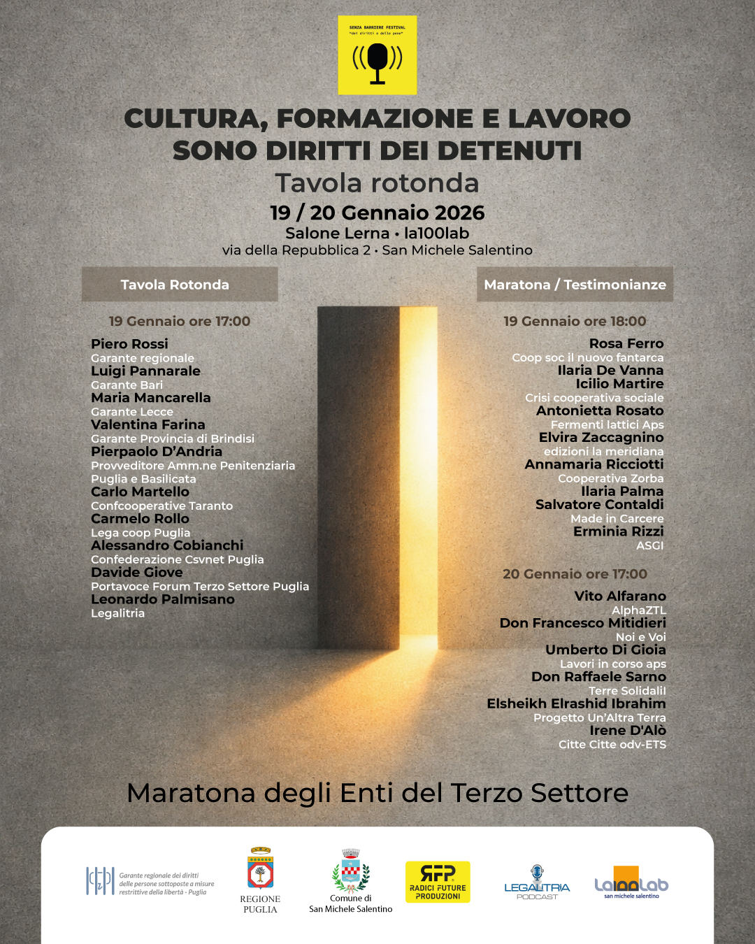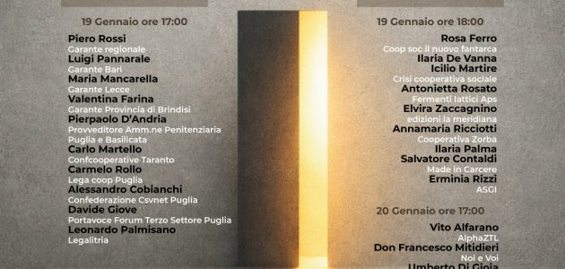 Il programma si apre lunedì 19 gennaio alle ore 17:00 con una tavola rotonda che vedrà la partecipazione di Piero Rossi, Garante regionale dei diritti delle persone sottoposte a misure restrittive della libertà personale (Regione Puglia); Luigi Pannarale, Garante territoriale per la città di Bari; Maria Mancarella, Garante territoriale per la città di Lecce; Valentina Farina, Garante territoriale per la Provincia di Brindisi; Pierpaolo D’Andria, Provveditore dell’Amministrazione Penitenziaria per Puglia e Basilicata; Carlo Martello, segretario generale di Confcooperative Taranto; Carmelo Rollo, Legacoop Puglia; Alessandro Cobianchi, Confederazione CSVnet Puglia; Davide Giove, portavoce del Forum Terzo Settore Puglia; Leonardo Palmisano, Legalitria.