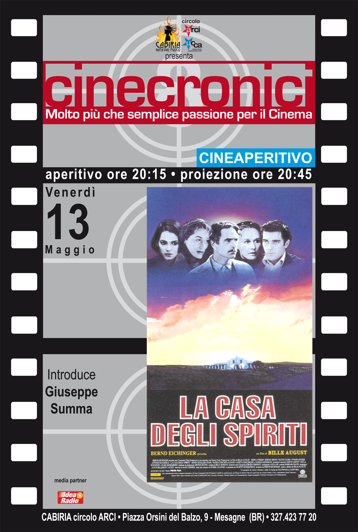 Si terrà venerdì 13 maggio, presso Cabiria (Unione Circoli Cinematografici Arci) in piazza Orsini del Balzo 9 a Mesagne (Br), il prossimo appuntamento con il CineAperitivo della rassegna “Cinecronici” questo mese dedicato al tema dei legami familiari. Si inizierà alle 20:15 con uno speciale “aperitivo benessere” e si proseguirà alle 20:45 con l’introduzione e la proiezione del film “La casa degli spiriti” di Bille August (Germania-Portogallo-Danimarca-Usa, 1993, drammatico, 140’) con Jeremy Irons, Meryl Streep, Glenn Close, Winona Ryder, Antonio Banderas.