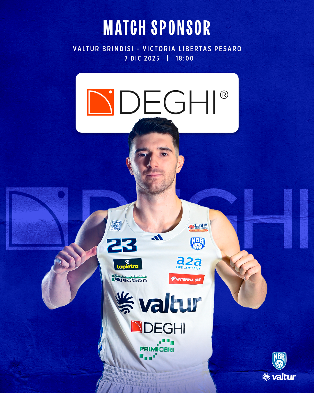 DEGHI S.p.A., Gold Sponsor biancoazzurro, sarà il match sponsor della partita di campionato tra la Valtur Brindisi e la Victoria Libertas Pesaro, in programma domenica 7 dicembre al PalaPentassuglia alle ore 18:00.