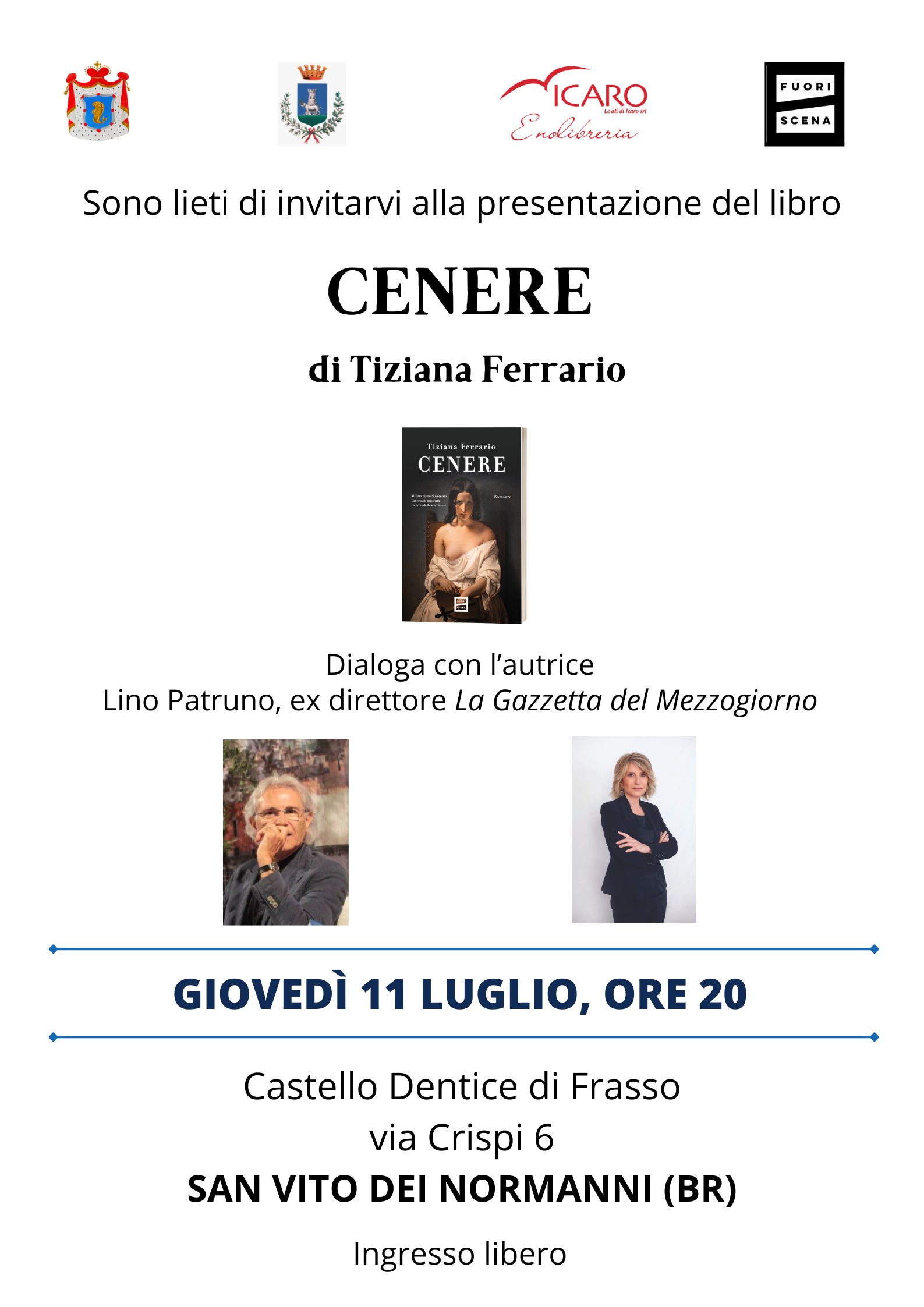 Casa Dentice di Frasso, con il patrocinio del Comune di San Vito dei Normanni, ha organizzato per le ore 20 di giovedì 11 luglio p.v. nel cortile del Castello la presentazione dell’ultimo romanzo della giornalista e scrittrice Tiziana Ferrario, Cenere (Fuori scena, Milano 2024, pp. 300).