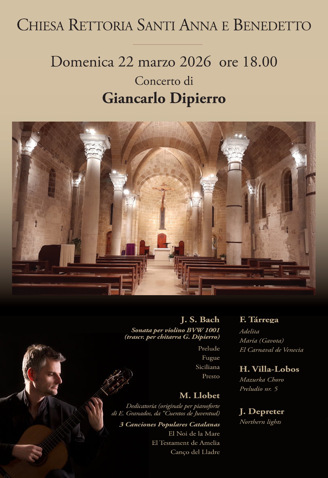 Il repertorio del concerto per chitarra spazia dalle musiche di Bach (Sonata per violino BVW 1001 trasc. per chitarra), Llobet (3 Canciones Populares Catalanas), Tarrega, Villa-Lobos e Depreter.