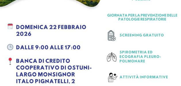 Domenica prossima, 22 febbraio, dalle 9 alle 17, ad Ostuni, in via Ludovico Pepe 50, nel Piazzale antistante la Banca di Credito Cooperativo, organizzata dalla Asl di Brindisi, si terrà la 1° edizione della Giornata per la prevenzione delle patologie respiratorie.
