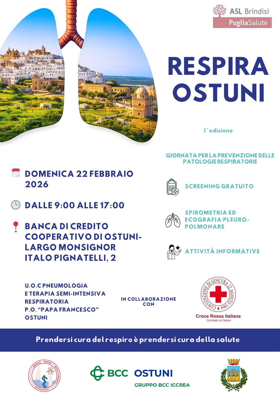 La manifestazione si chiama “RESPIRA OSTUNI” ed è aperta a tutti i cittadini del territorio brindisino; ci sarà uno screening gratuito a cura del noto reparto di Pneumologia dell’Ospedale civile di Ostuni diretto dall’insigne dr. Pierluigi Bracciale con spirometria ed ecografia pleuro -polmonare, per tutti coloro che si presenteranno.
